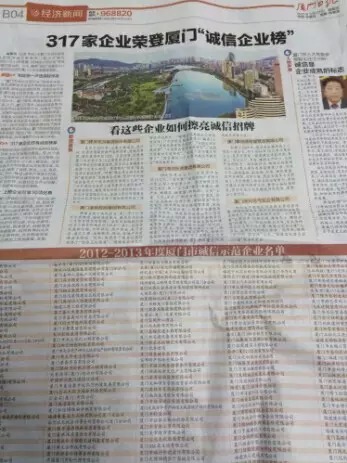 公司榮登廈門(mén)誠信企業(yè)榜